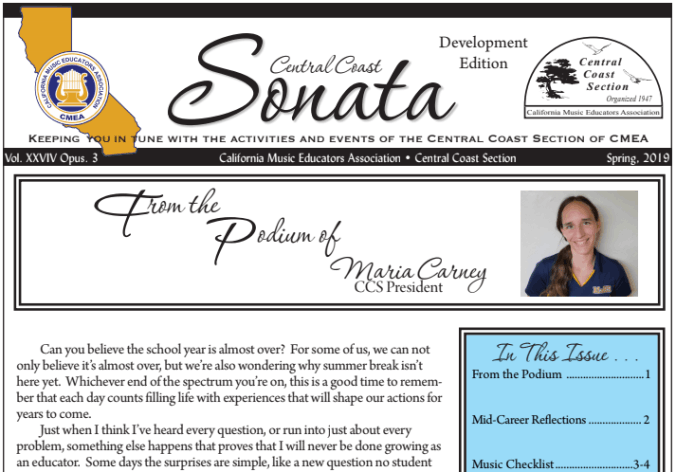 The Sonata is our newsletter, with three editions each year: Exposition, Development, and Recapitulation. Each edition contains articles written by CCS members. Previous editions of the Sonata are archived here. If you have an article you would like to submit for a future edition of the Sonata, contact the current Sonata editor.